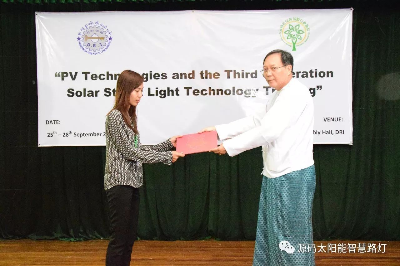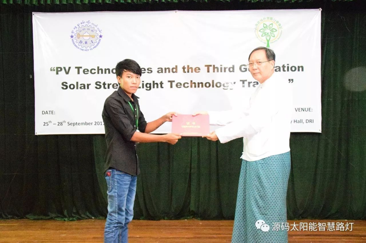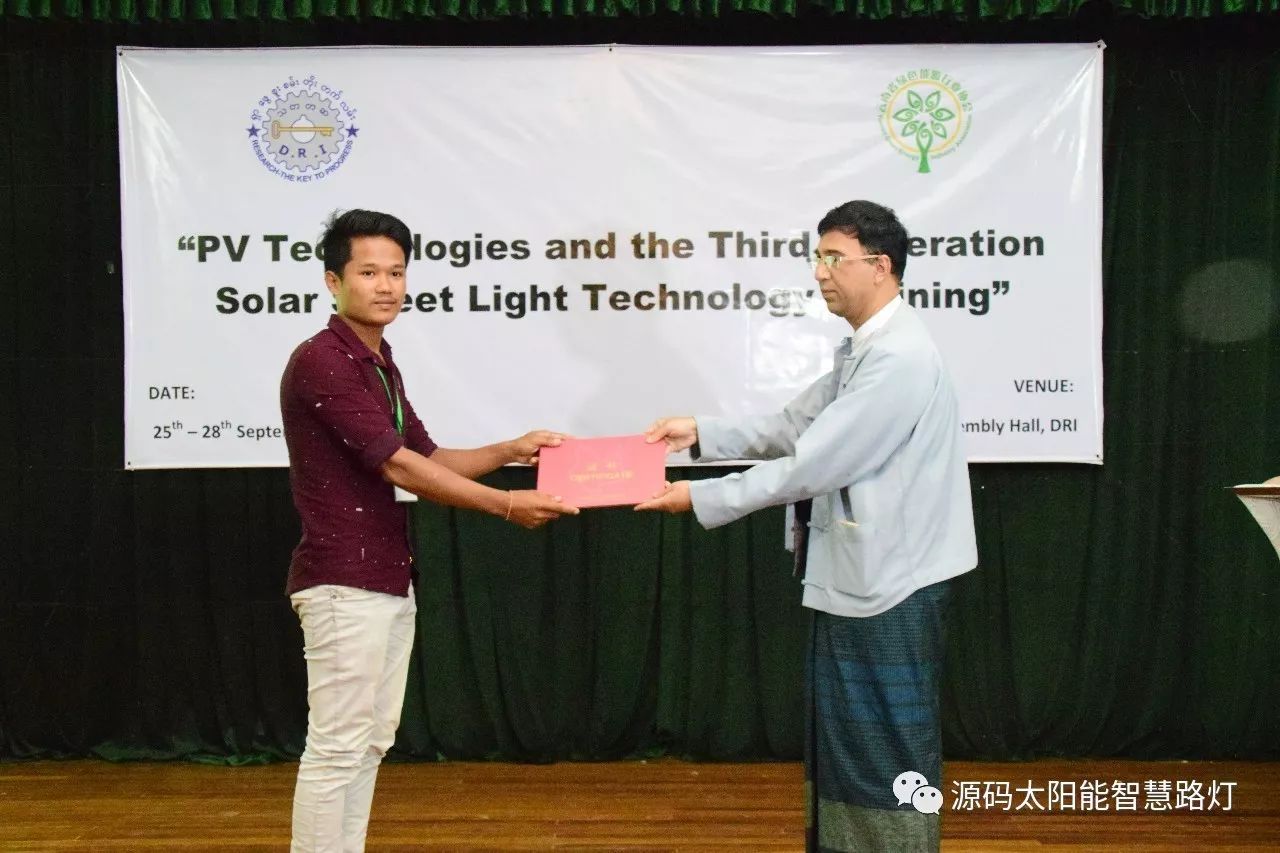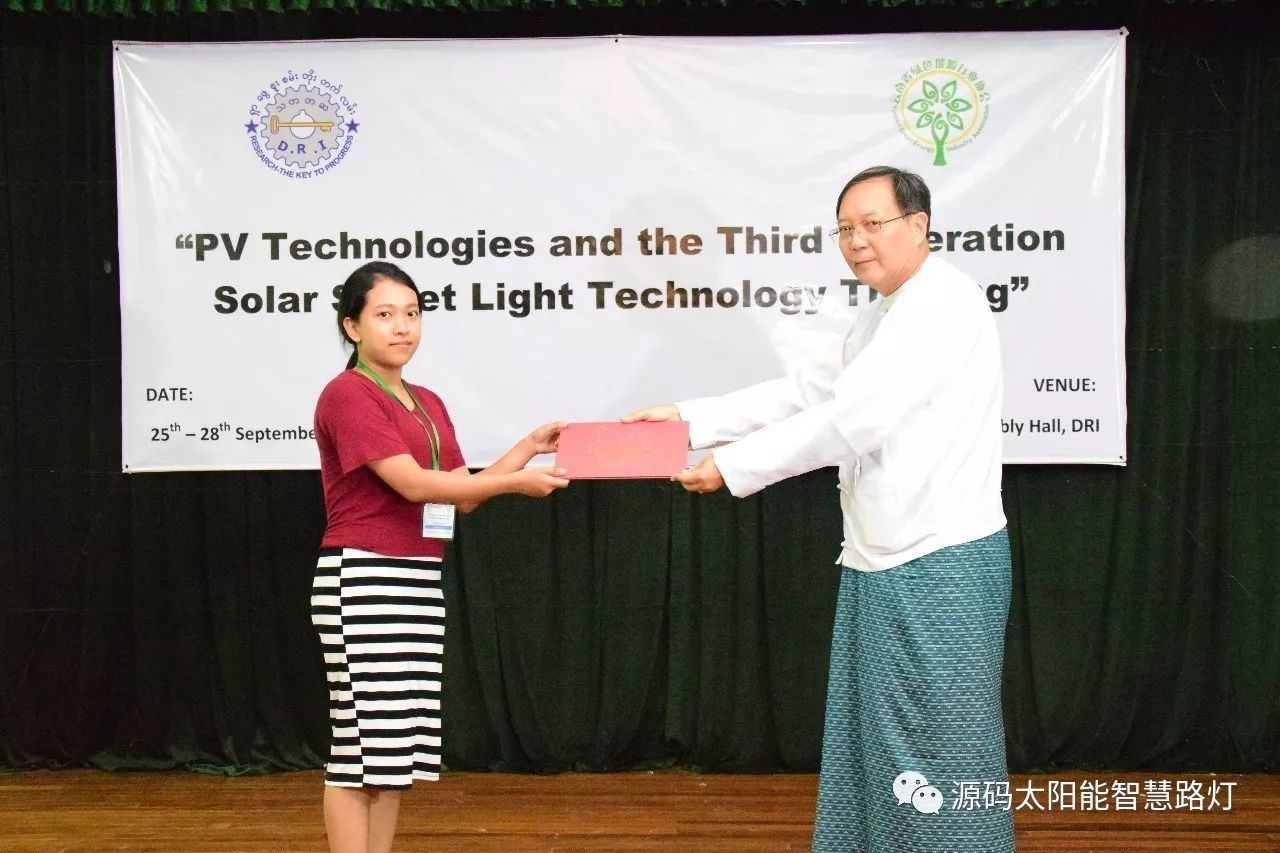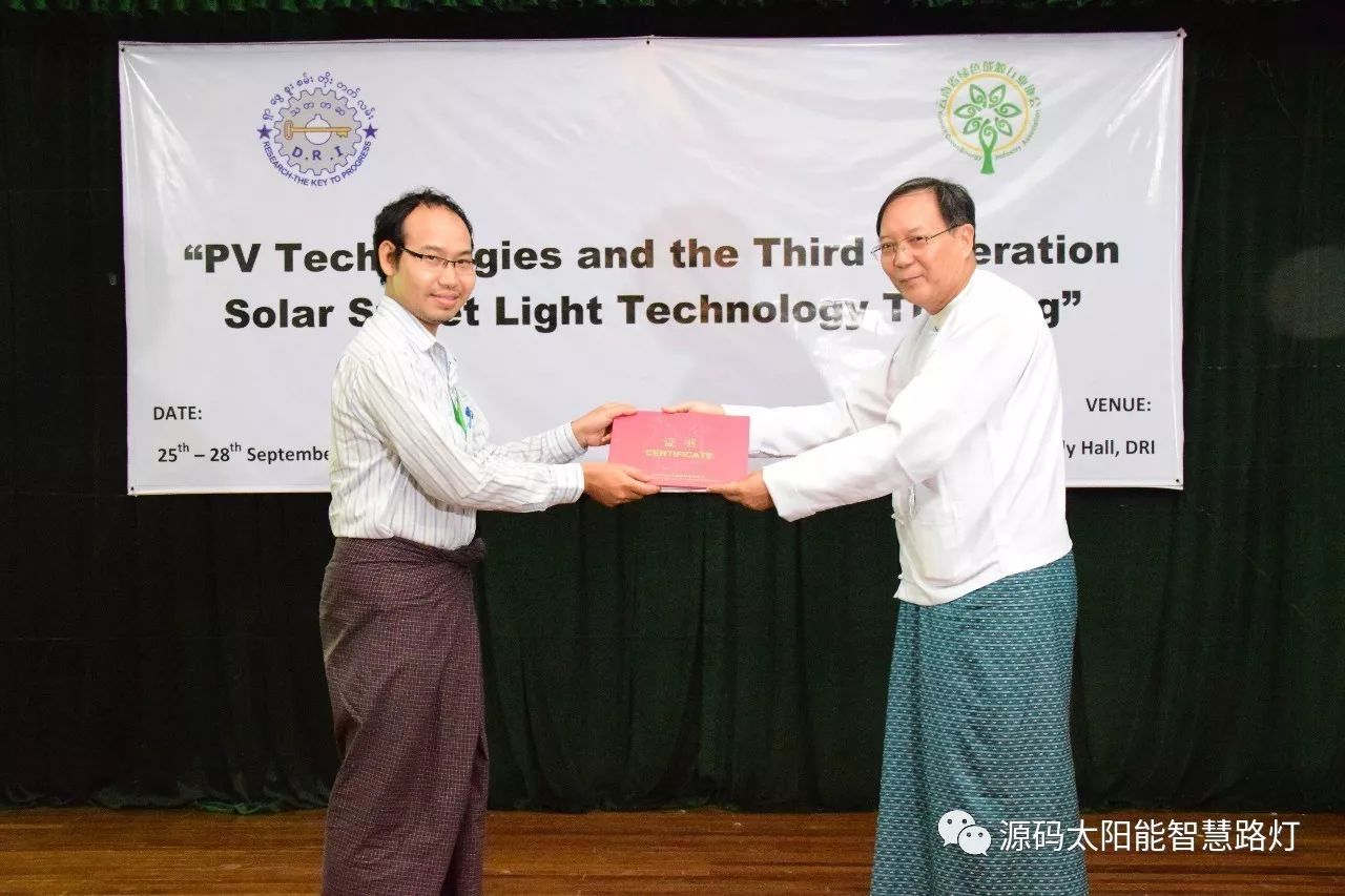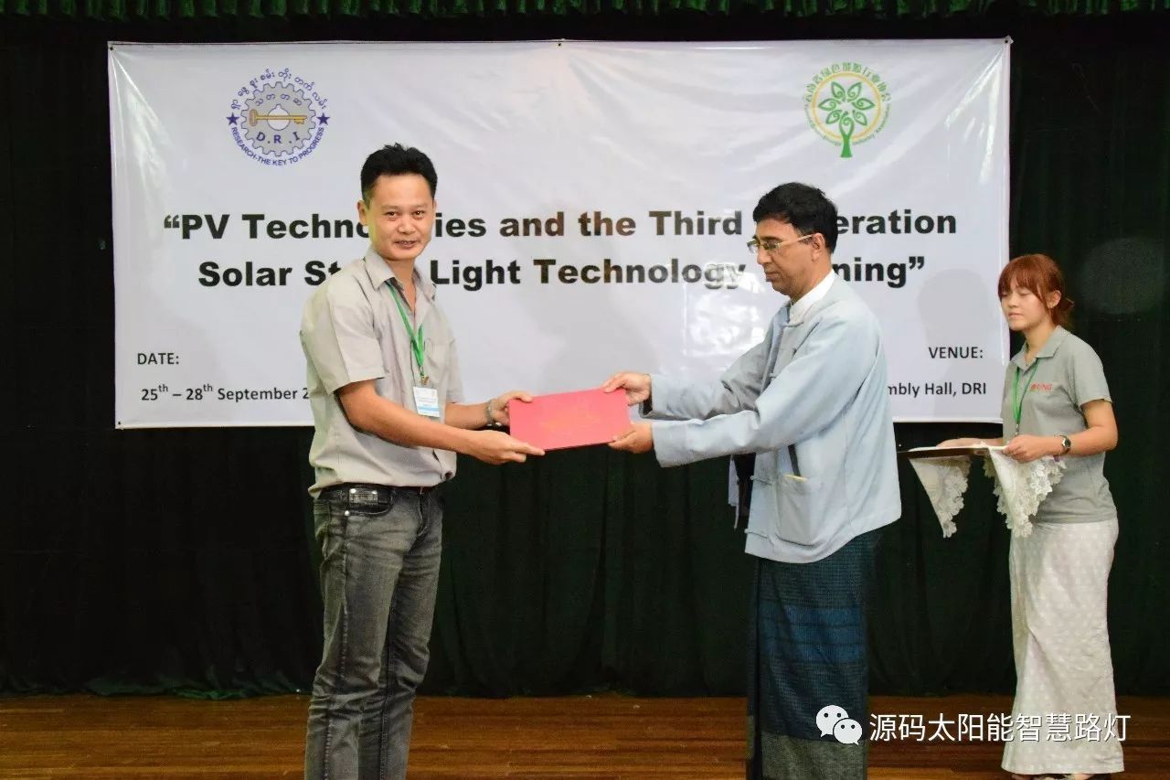 在培訓(xùn)會議后,大家對此次的培訓(xùn)綜合內(nèi)容及取得的效果進(jìn)行了深入研討,參與此次培訓(xùn)的能源部、政府部門的相關(guān)人員以及大學(xué)教授、企業(yè)代表都對此次培訓(xùn)會的效果表示滿意,也希望以后能有更多的類似的培訓(xùn)會,源碼也希望在以后的培訓(xùn)中能夠給他們帶來更好的效果。研討會后,中國駐緬甸大使館領(lǐng)導(dǎo)對本次會議作了總結(jié):對本次培訓(xùn)會議的培訓(xùn)方云南省綠色能源行業(yè)協(xié)會以及源碼太陽能智慧路燈表示感謝,表示此次會議對雙方的技術(shù)交流學(xué)習(xí)以及中緬兩國友誼的加深都取到了十分良好的效果。接著緬甸教育部科技司司長則親自向所有通過考試的學(xué)員頒發(fā)了證書,在頒獎過程中,源碼也向緬甸教育部科技司捐贈了兩套太陽能智慧路燈。