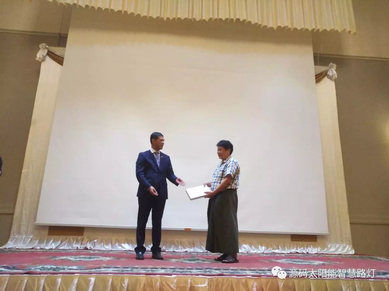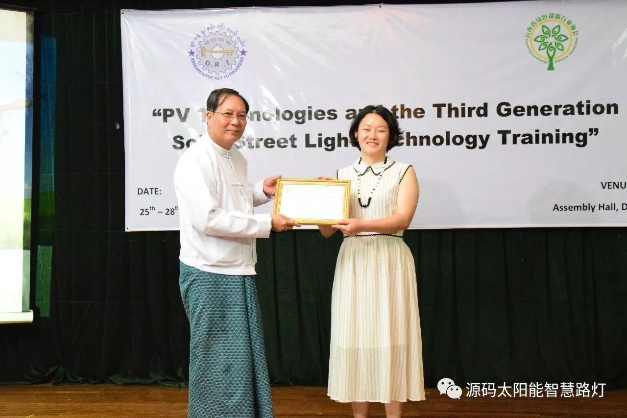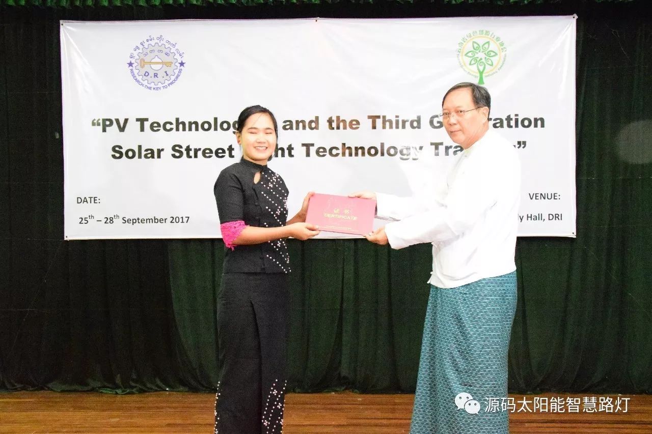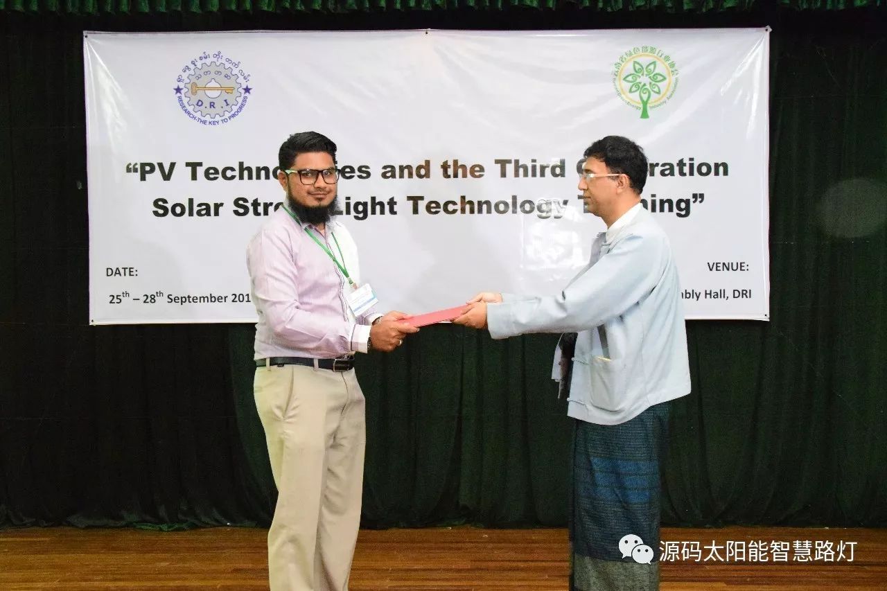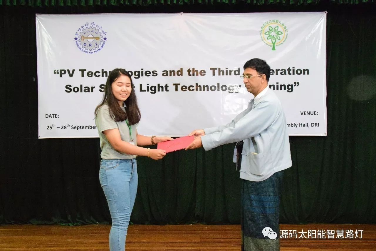 在培訓(xùn)會議后,大家對此次的培訓(xùn)綜合內(nèi)容及取得的效果進(jìn)行了深入研討,參與此次培訓(xùn)的能源部、政府部門的相關(guān)人員以及大學(xué)教授、企業(yè)代表都對此次培訓(xùn)會的效果表示滿意,也希望以后能有更多的類似的培訓(xùn)會,源碼也希望在以后的培訓(xùn)中能夠給他們帶來更好的效果。研討會后,中國駐緬甸大使館領(lǐng)導(dǎo)對本次會議作了總結(jié):對本次培訓(xùn)會議的培訓(xùn)方云南省綠色能源行業(yè)協(xié)會以及源碼太陽能智慧路燈表示感謝,表示此次會議對雙方的技術(shù)交流學(xué)習(xí)以及中緬兩國友誼的加深都取到了十分良好的效果。接著緬甸教育部科技司司長則親自向所有通過考試的學(xué)員頒發(fā)了證書,在頒獎過程中,源碼也向緬甸教育部科技司捐贈了兩套太陽能智慧路燈。