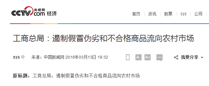 筆者發現,國家工商總局近日在官網公布《關于開展2018年紅盾質量維權行動的通知》?!锻ㄖ诽岢?,突出工作重點全面強化監管執法。各地工商和市場監管部門要圍繞當前商品和服務質量突出問題,著力加強商品和服務質量監督檢查力度。《通知》尤其提到了過往關注力度稍弱的農村市場,要嚴厲打擊偽劣商品違法行為,遏制假冒偽劣和不合格商品流向農村市場。