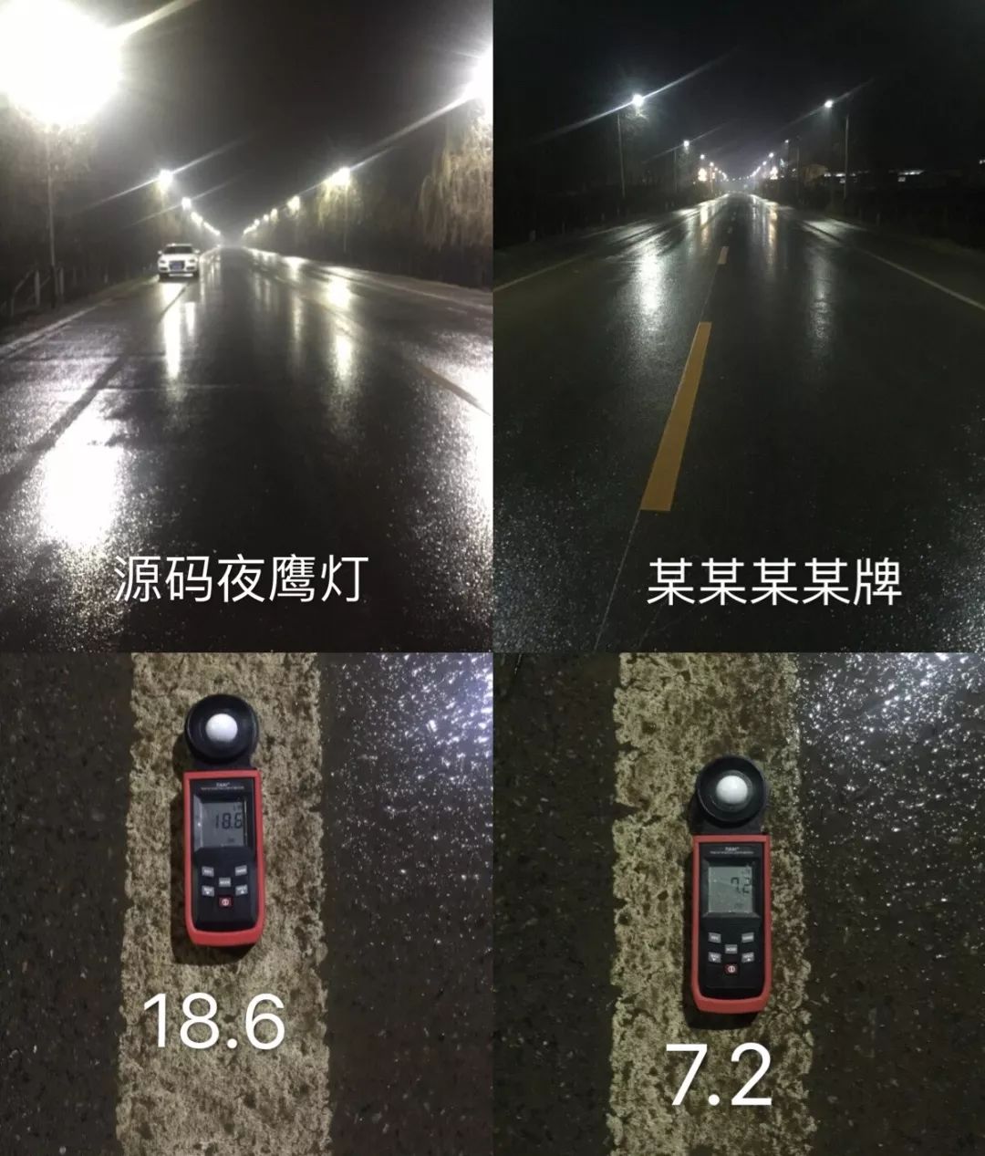 同一道路不同標段下源碼夜鷹燈與某牌太陽能路燈對比