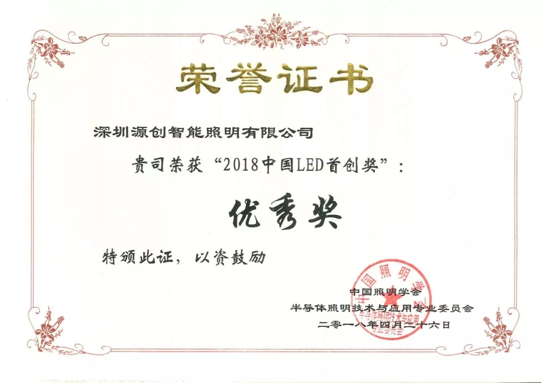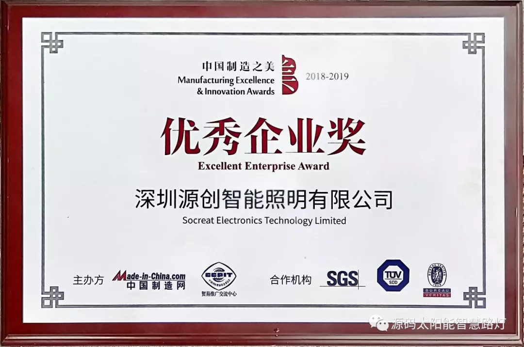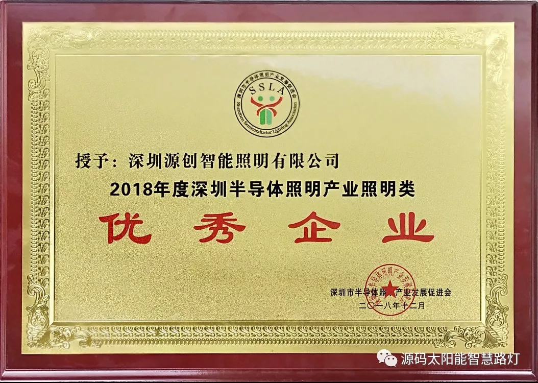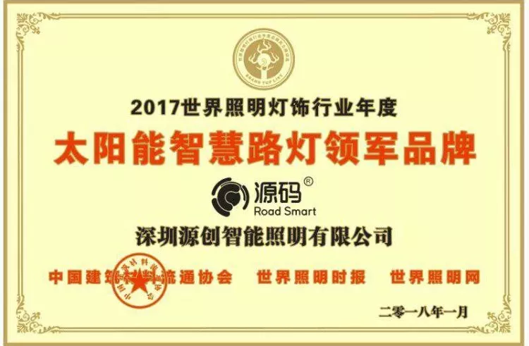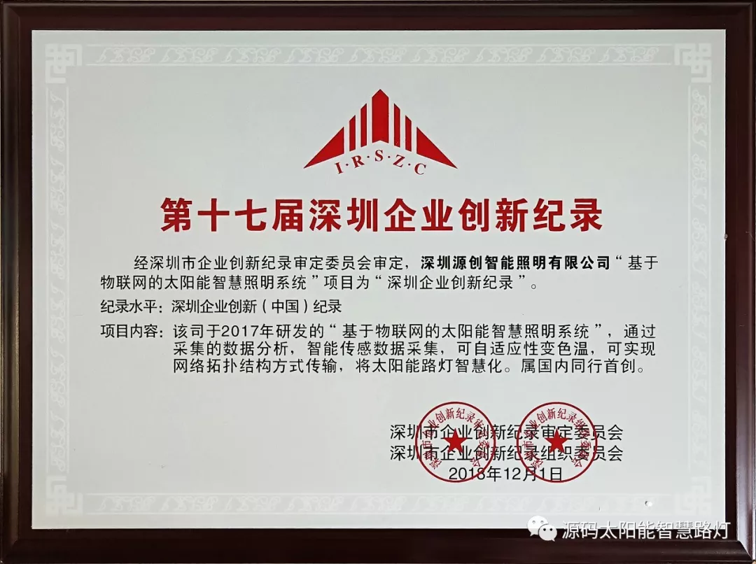 2019年1月9日,第十七屆深圳企業(yè)創(chuàng)新紀(jì)錄成果發(fā)布會(huì)暨深圳工業(yè)總會(huì)、深圳市先進(jìn)制造業(yè)聯(lián)合會(huì)、深圳市企業(yè)品牌建設(shè)促進(jìn)會(huì)2018年度會(huì)員大會(huì)在深圳舉行。深圳源創(chuàng)智能照明有限公司,憑借在太陽能路燈創(chuàng)新技術(shù)的突出優(yōu)勢(shì)獲得“深圳企業(yè)創(chuàng)新(中國(guó))紀(jì)錄”獎(jiǎng)。