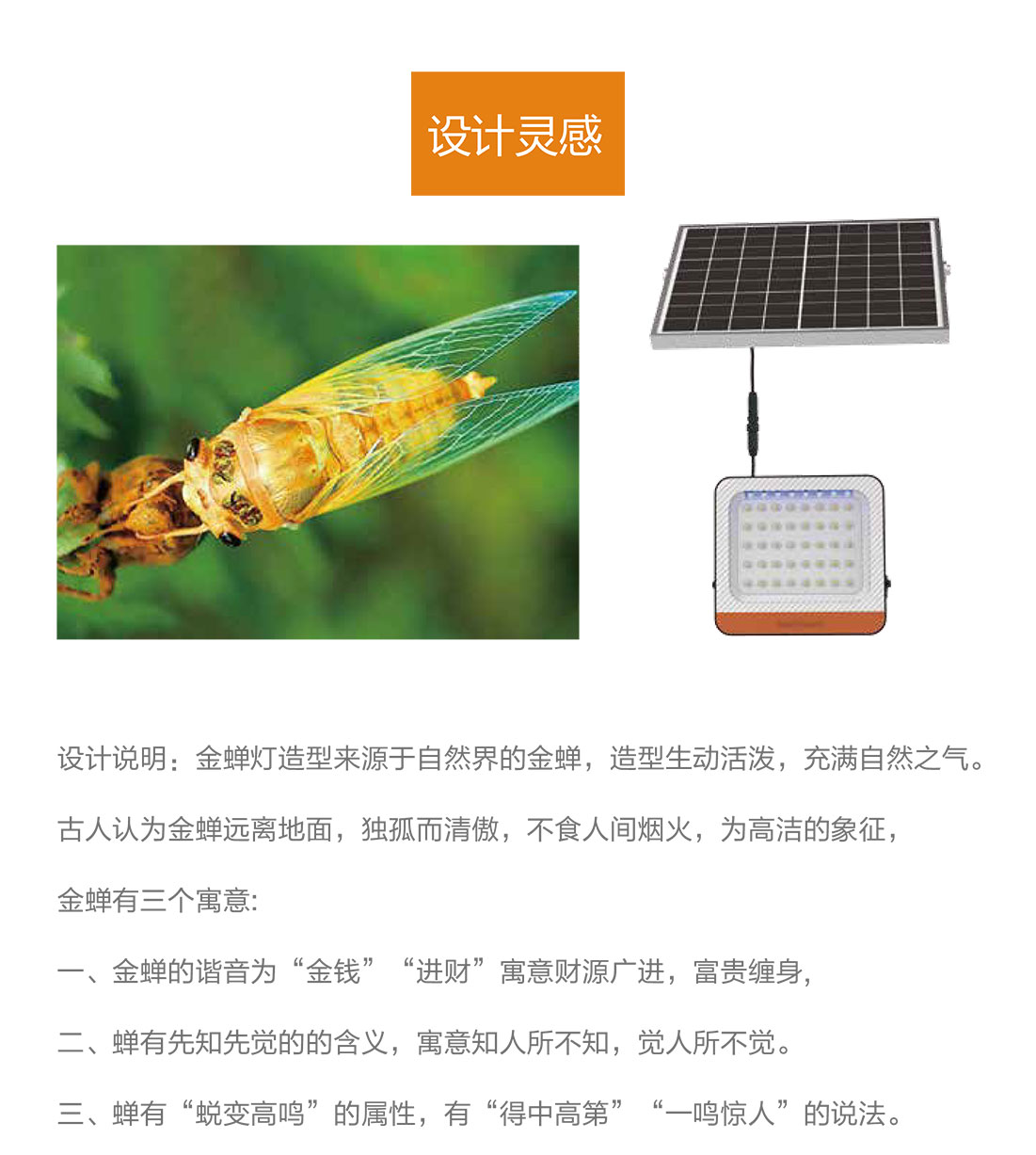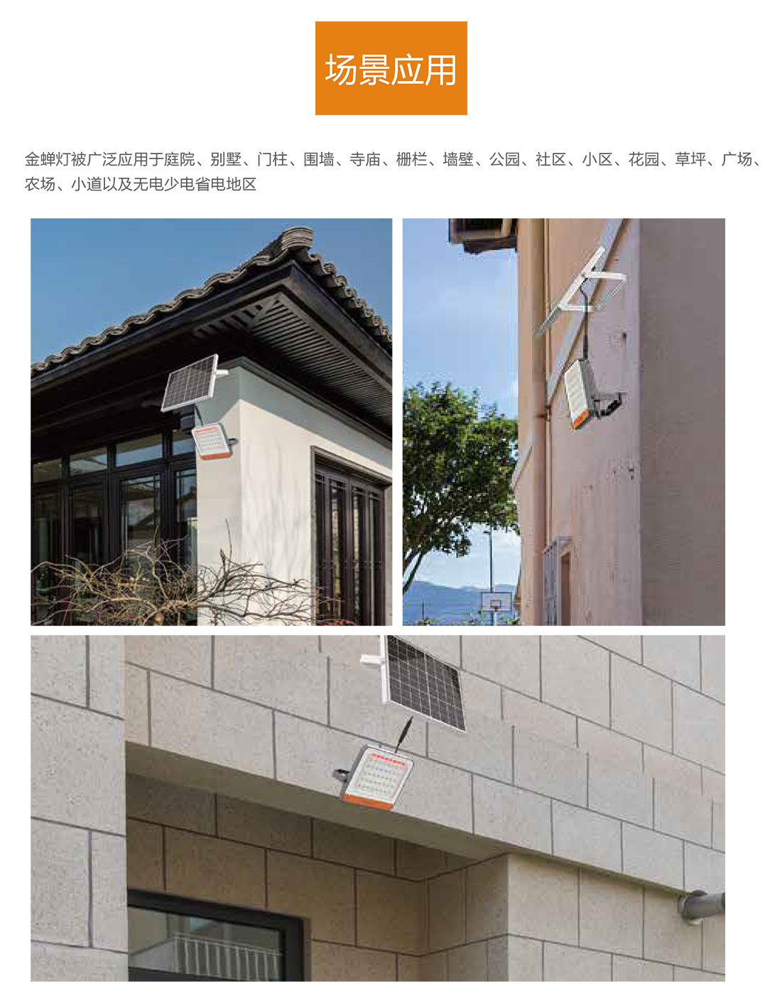 金蟬燈作為太陽(yáng)能投光燈,被廣泛應(yīng)用于庭院、廣場(chǎng)、私家花園、別墅、寺廟、農(nóng)場(chǎng)、戶外廣告牌等場(chǎng)景。